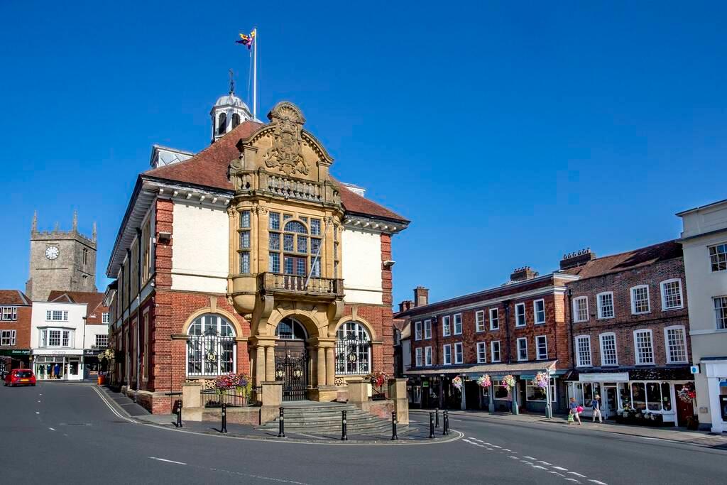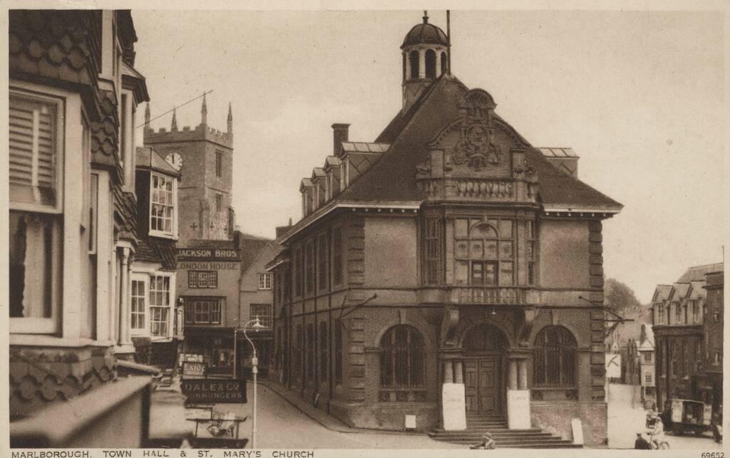 Standing majestically at the end of the High Street is Marlborough Town Hall. A dramatic mix of red brick and stone, complete with Doric columns, it was designed by local architect Charles Edwin Ponting and built between 1900 and 1902. Some form of Guildhall is thought to have stood at the east end of the High Street since the 13th century. That building or its successors were repaired in the 1570s and 1580s. In the 1630s a new guildhall or town hall was built incorporating a market house but it was destroyed in the Great Fire of Marlborough in 1653. That hall and its successors were supported by tall pillars, creating an arcade where markets were held. The hall above the market place was as a magistrate’s court and prison. It had another makeover in 1867 but by the end of the century it was clear the building was not fit for purpose. The decision was taken to demolish it – and not a moment too soon according to the local paper which described its demolition in 1900 as “A Death Trap Gone”, highlighting its poor construction and the risk of fire. In today’s Town Hall the courtroom is now used for events and ceremonies, but it still has a trapdoor leading to what were the cells. The Assembly Room is also a popular venue with its beautiful chandeliers and vaulted ceiling. The Council Chamber is still used by the Town Council for committee meetings.